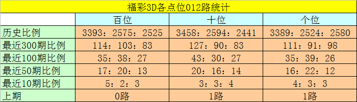 百位分析:该位最近10期开出了5个0路号码、2个1路号码、3个2路号码,0路号码热出,1路号码走冷。本期排除2路号码,参考号码:3。