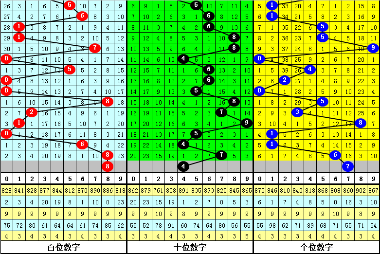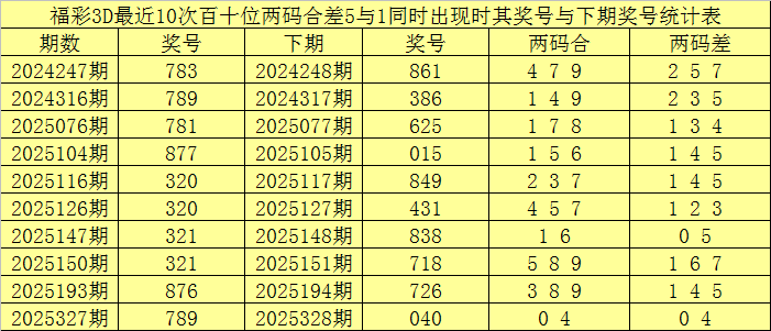 百十位合差分析:上期奖号百十位开出87组合,两码合为5,两码差为1,最近10次百十位两码合5与两码差1同时出现时,其奖号和下期奖号分别为: