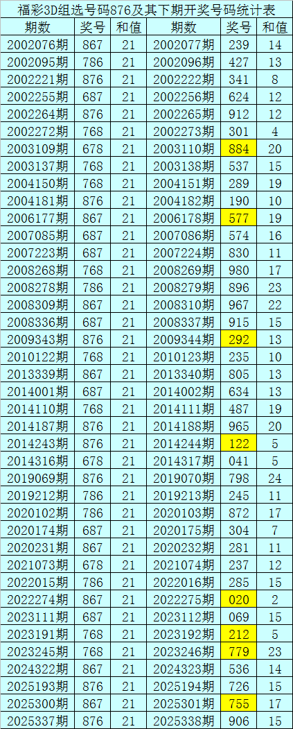 一、开奖回顾:第2025337期福彩3D奖号为876。奖号奇偶比为1:2,和值为:21,跨度为:2。
