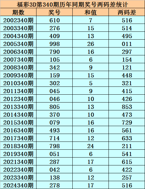 福彩3D第340期,历史上期开出22次奖号,其奖号分别为:610、276、409、998、790、105、342、159、302、045、046、805、370、079、493、714、798、051、287、042、138、278,奖号两码合差分别开出: