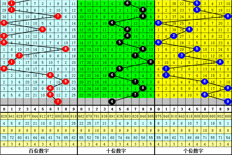 百位:2025335期-2025339期出号:06866,振幅为8点,分布比较分散,本期预计百位走大,参考7。
