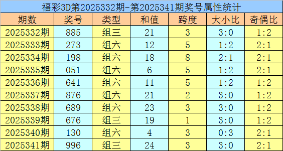 开奖回顾:福彩3D第2025341期开出奖号996。奖号形态为组三,奇偶比为2:1,012路比为3:0:0,大小比为3:0,和值为24,跨度为3。