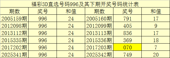 一、开奖回顾:第2025341期福彩3D奖号为996。奖号奇偶比为2:1,和值为:24,跨度为:3。