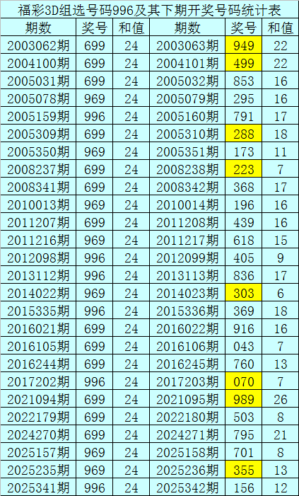 二、组选分析:历史上组选号码996开出了26次,其下期奖号分别为:949-499-853-295-791-288-173-223-368-196-439-618-405-836-303-369-916-043-760-070-989-503-795-701-355,其开出期数和下期奖号统计为: