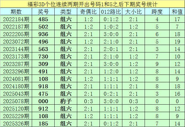 个位号码:最近两期个位开出号码为1-5,在福彩3D历史开奖中,前后两期个位分别开出号码1-5的奖号出现了84次。最近15期个位1-5组合出现之后,其下期奖号分别为:485-502-936-496-563-730-309-491-108-918-475-000-912-108-185;