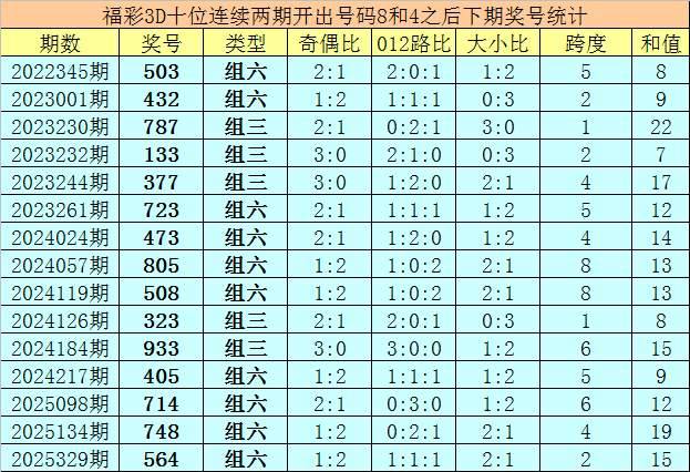 十位号码:前两期十位分别出现奖号8-4,历史上福彩3D连续前后分别开出号码8-4的现象共开出91次。在十位8-4的现象出现时,最近15期其下期分别开出号码:503-432-787-133-377-723-473-805-508-323-933-405-714-748-564;