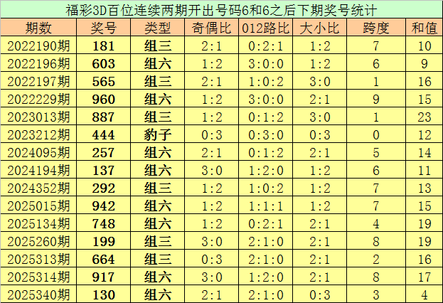 百位号码:连续两期百位出号分别为:6-6,历史上福彩3D连续两期前后分别出号6-6的奖号共出现113次。在百位6-6的奖号现象出现时,近15期下期分别出号:181-603-565-960-887-444-257-137-292-942-748-199-664-917-130;