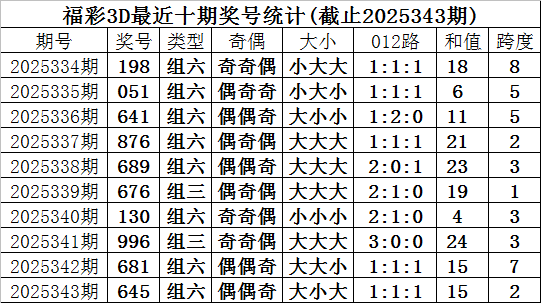 开奖回顾:福彩3D第2025343期奖号为645,奖号形态为:组六、大小大、1:1:1、偶偶奇。