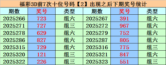 在十位开奖中,号码2前7次出现之后,下期奖号分别为:9、6、5、0、7、4、5,其中奖号大小比为5:2,012路比为3:2:2,奇偶比为4:3。