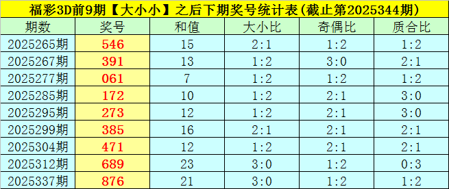 5、在下期奖号中,号码大小比为:2:1、1:2、1:2、1:2、1:2、2:1、1:2、3:0、3:0,号码大小比总比例为15:12,本期预计大号活跃,关注大小比2:1。
