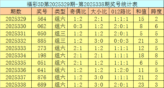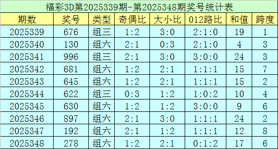 上期回顾:福彩3D第2025348期开奖号码为278,组选类型为组六,奇偶比为1:2,大小比为2:1。
