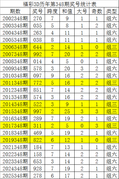 从以上统计可以看出,历年3D第349期开出了5次组三号码,开出了17次组六号码。组六号码出现概率大,本期预计开出组六号码。