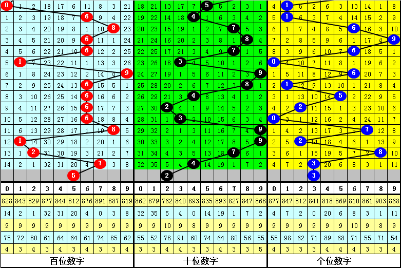 百位上期出现:冷号7,该位连续十期以热号出现较多,以冷号出现较少,目前该位遗漏15期以上的冷号有3个:3、4、5,本期注意该位冷号逐渐解冻,关注冷号5。