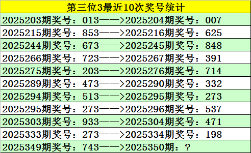 第三位推荐:上期奖号为3,近10次3出现之后,下期个位分别开出:7、5、8、1、4、2、3、7、1、8,大小 号码个数比为5:5,相当;奇偶号码个数比为6:4,基本持平;012路号码个数比为1:5:4,0路号码明显较冷。本期参考号码0。