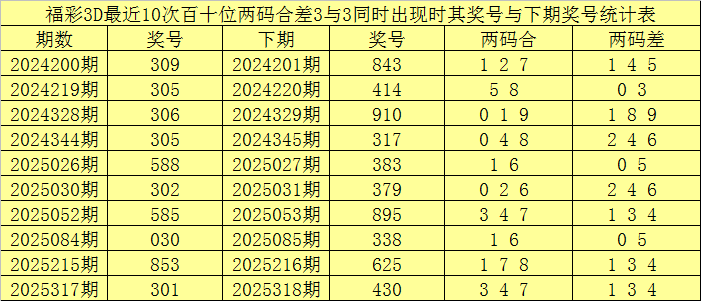 从以上统计可以看出,百十位两码合差3与3同时出现之后其下期两码合差表现最热的4个分别为:1345,本期百十位两码合差可以参考这四码中的数据。