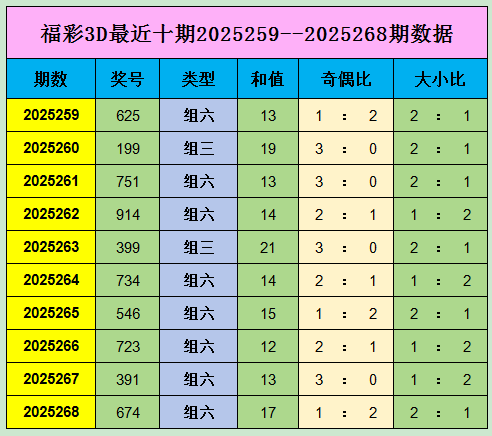 福彩3D上期开出奖号为674,奖号为组六形态,和值为17,奇偶比为1 : 2,大小比为2 : 1。