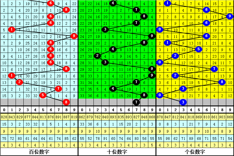 十位上期奖号为:温号8,最近十位主要为热号,冷号开出次数相对较低,该位目前有5个热号:3、4、7、8、9,本期预计该位开出热号,注意号码7再出。