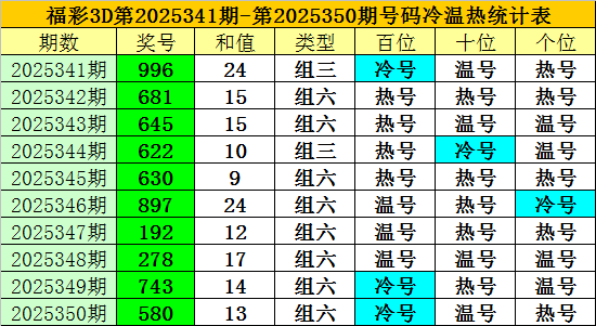 上期回顾:福彩3D第2025350期开奖奖号为:580,奖号类型为:组六,奖号冷温热态为:冷号+温号+热号。