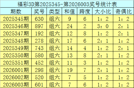 上期回顾:福利彩票3D第2026003期奖号为601。