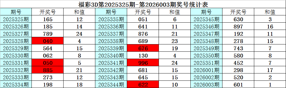 上期回顾:福彩3D第2026003期奖号为:601,其中奖号组选类型为:组六,奇偶比为1:2,大小比为1:2,012路比为2:1:0,和值为7,跨度为6。
