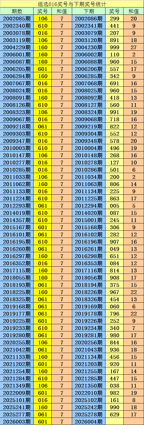 第2026003期3D奖号组选为:016,历史上该号码组选出现57次,下期号码分别为:299、441、207、891、999、110、960、557、342、691、960、418、560、991、718、822、552、578、496、268、127、501、200、806、225、863、005、087、245、306、282、907、049、651、084、814、908、375、967、454、060、796、252、340、980、844、936、456、920、167、447、038、982、161、990、629。