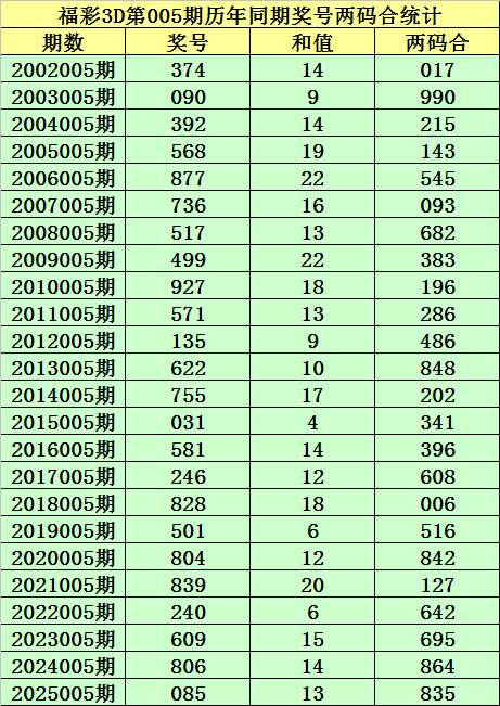 福彩3D第005期,历史上期开出24次奖号,其奖号分别为:374、090、392、568、877、736、517、499、927、571、135、622、755、031、581、246、828、501、804、839、240、609、806、085,奖号两码合差分别开出: