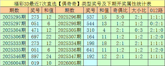 前7次出现偶奇奇类型奖号分别为:273、051、471、697、273、051、897,其下期分别开出奖号:537、544、310、164、198、641、192。