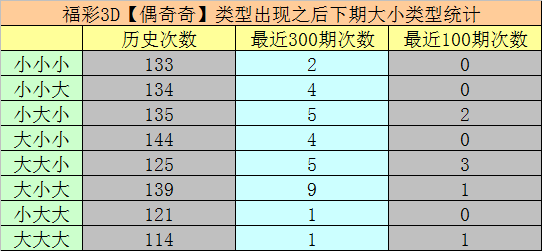 一、福彩3D上期奖号为019,大小类型开出:小小大,历史上该大小类型奖号共出现1046次,最近7次【小小大】奖号分别开出:406、408、045、416、117、448、226,其中组三号码出现3次,组六号码出现4次。