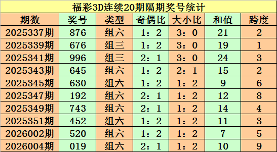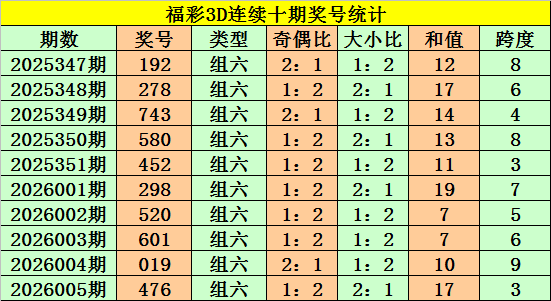 上期回顾:福彩3D第2026005期奖号:476。组六、小大大、偶奇偶。