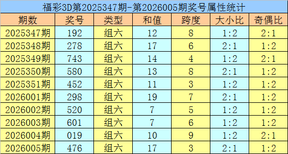 开奖回顾:福彩3D第2026005期开出奖号476。奖号形态为组六,奇偶比为1:2,012路比为1:2:0,大小比为2:1,和值为17,跨度为3。