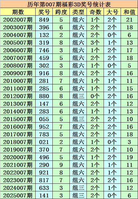 历年第007期福彩3D同期奖号为:849 - 396 - 132 - 319 - 746 - 459 - 302 - 916 - 281 - 285 - 880 - 147 - 283 - 055 - 952 - 783 - 021 - 370 - 496 - 290 - 921 - 817 - 633 - 141。