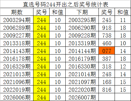 福彩3D第2026006期开出直选号码为:244,该直选号码历史上出现了11次,其下期分别开出了号码:245、918、738、460、077、387、318、248、168、816,如图: