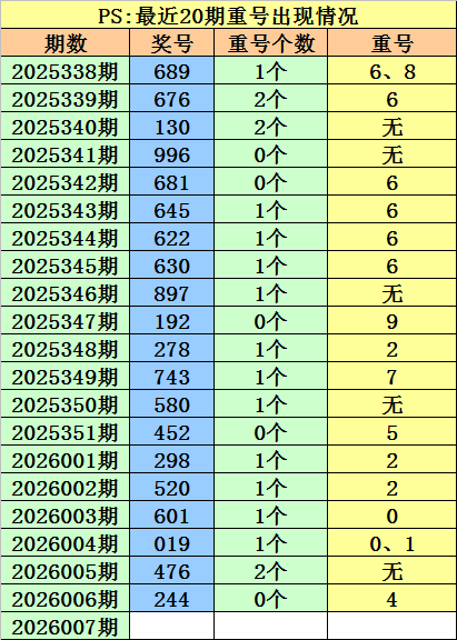 最近100期开奖中,含有重号的奖号有69期,最近20期含有重号的奖号有15期,最近10期含有重号的奖号有8期。本期注意重号落号。。本期排除重号。