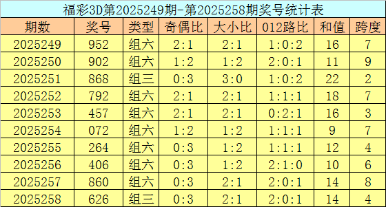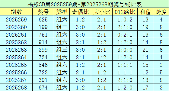 上期回顾:福彩3D第2025268期开奖号码为674,组选类型为组六,奇偶比为1:2,大小比为2:1。