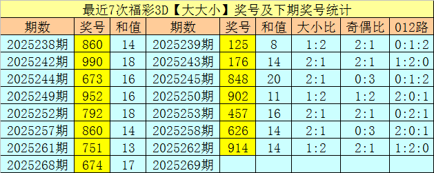 一、福彩3D上期奖号为674,大小类型开出:大大小,历史上该大小类型奖号共出现1046次,最近7次【大大小】奖号分别开出:860、990、673、952、792、860、751,其中组三号码出现1次,组六号码出现6次。