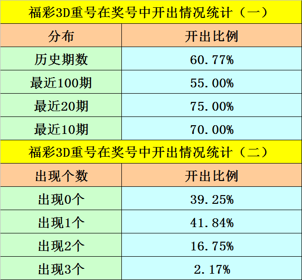 最近100期开奖中,含有重号的奖号有55期,最近20期含有重号的奖号有15期,最近10期含有重号的奖号有7期。本期注意重号落号。