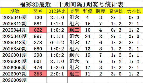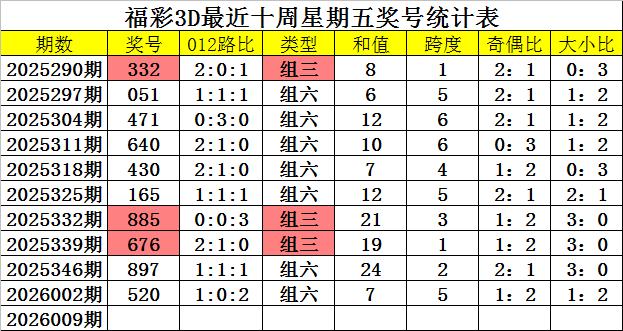 奖号类型分析:从近期周五开奖数据分析,组六近期热出,十周内出现7次,上周五为组六号码,组三出现3次,表现相对较冷,本周五预计继续开出组六号码。