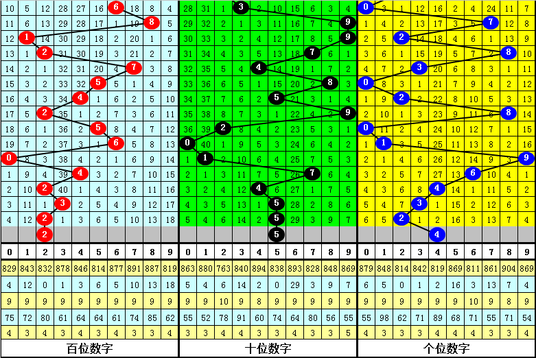 前7期012路比为3:1:3,1路号码走势较冷,目前012路号码遗漏值分别为:1期、3期和0期,本期该位注意2路号码。