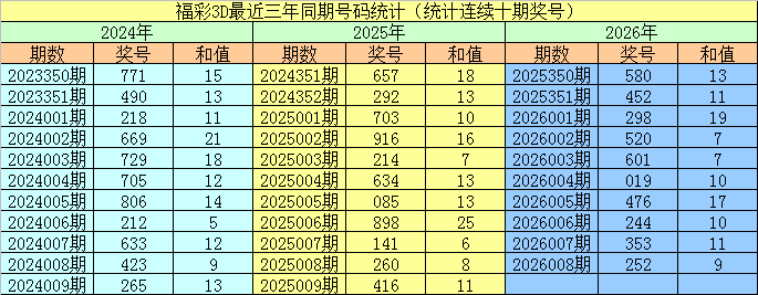 福彩3D上期奖号为252,去年同期与今年同期前20期奖号对比。