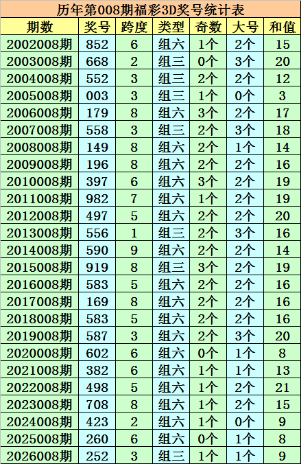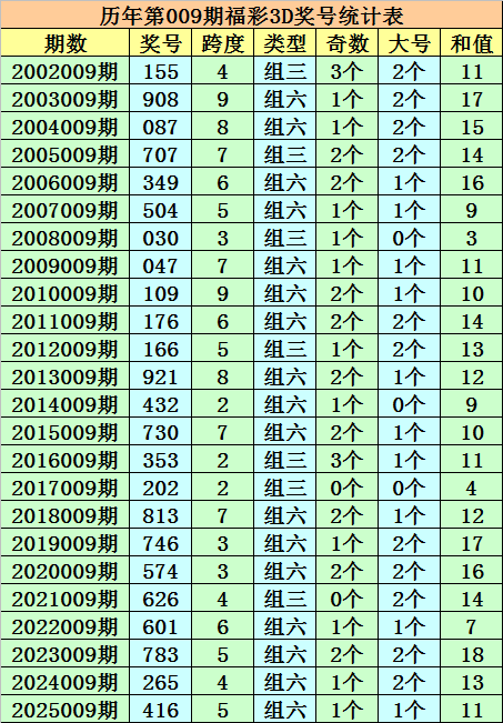历年第009期福彩3D同期奖号为:155 - 908 - 087 - 707 - 349 - 504 - 030 - 047 - 109 - 176 - 166 - 921 - 432 - 730 - 353 - 202 - 813 - 746 - 574 - 626 - 601 - 783 - 265 - 416。
