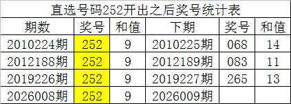 福彩3D第2026008期开出直选号码为:252,该直选号码历史上出现了4次,其下期分别开出了号码:068、083、265,如图: