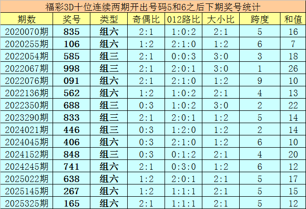 十位号码:前两期十位分别出现奖号5-6,历史上福彩3D连续前后分别开出号码5-6的现象共开出90次。在十位5-6的现象出现时,最近15期其下期分别开出号码:835-106-585-998-091-562-688-833-446-406-848-741-638-267-165;
