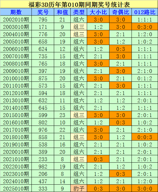 组选类型判断:在第010期历史同期开奖中,组六开出18次,组三开出5次,豹子开出1次,今年同期防开出组三号码。