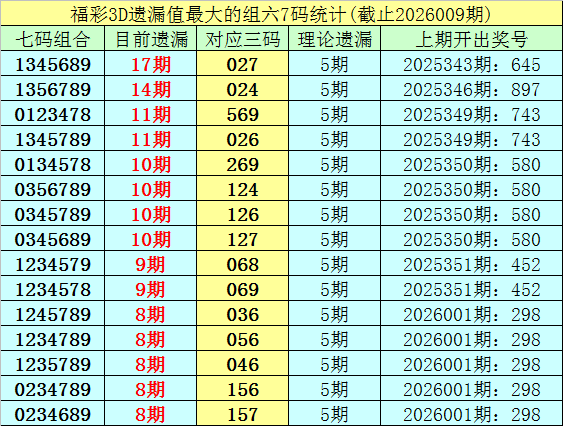 福彩3D七码遗漏组六分析(第2002001期-第2026009期)