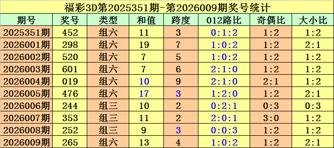 开奖回顾:第2026009期福彩3D奖号为265。
