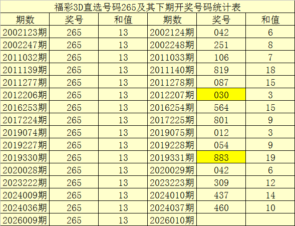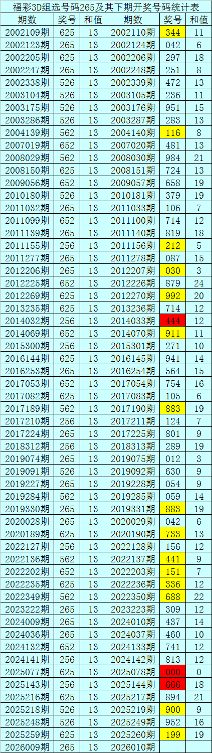 二、组选分析:历史上组选号码265开出了58次,其下期奖号分别为:344-042-297-251-472-236-951-283-116-481-984-724-658-379-106-714-819-212-087-030-879-992-714-444-911-271-941-564-754-105-883-124-801-289-012-630-054-059-883-042-733-156-441-151-336-688-309-437-460-741-813-000-666-894-900-952-199,其开出期数和下期奖号统计为: