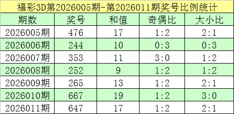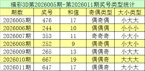 福彩3D第2026011期回顾:奖号为647,奖号奇偶比为1:2,大小比为2:1,和值为17,类型为组六。