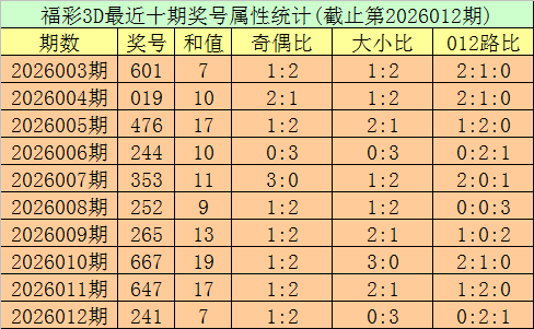 开奖回顾:第2026012期福彩3D奖号为241。奖号形态为组六,大小比为0:3,和值为7,奇偶比为1:2,012路比为0:2:1,跨度为3。