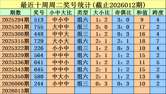 福彩3D第2026006期(上周二)奖号为244。