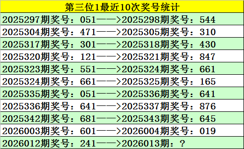 上期回顾:福彩3D第2026012期奖号241。和值7,跨度3,大小比0:3,奇偶比1:2。